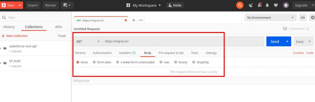 The above example is sending out a GET request to the https://reqres.in/ endpoint. Similarly we can send a POST request to the https://reqres.in/ endpoint too, with specifying the JSON body in the request via Postman too.