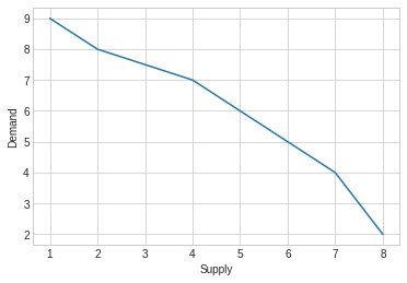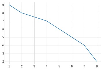 import numpy as np import matplotlib.pyplot as pl #creating array x = [1,2,4,5,6,7,8] #creating array y=[9,8,7,6,5,4,2] #simple plot plt.plot(x,y)